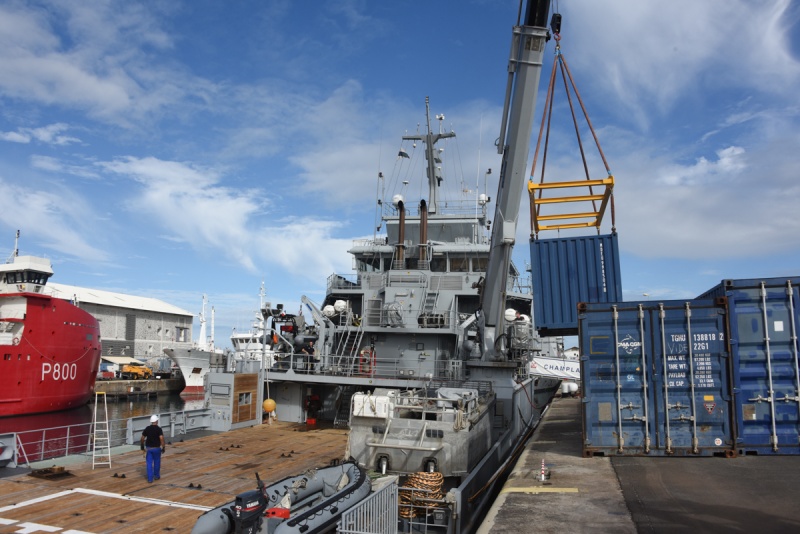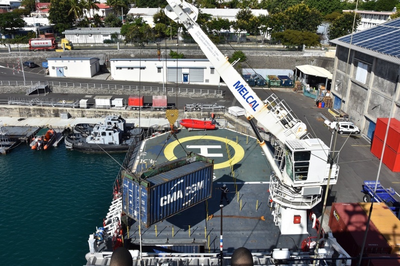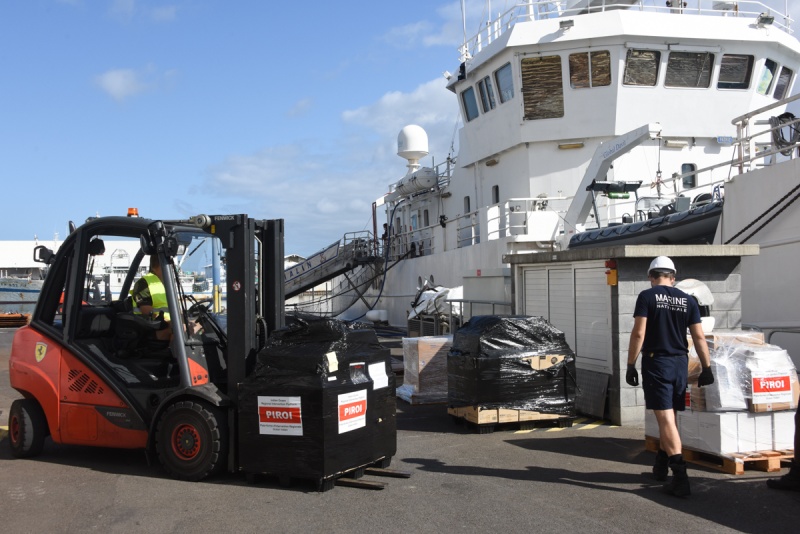 Cet ancien palangrier, aujourd’hui patrouilleur de la Marine nationale contribue lui aussi, grâce à ses capacités de stockage, au soutien de la population mahoraise lors de cette période de crise exceptionnelle. S’il transporte quelques denrées alimentaires, son chargement se compose avant tout de matériels médicaux tels que des visières, des ventilateurs pulmonaires et plusieurs palettes sanitaires fournies par la plate-forme d’intervention régionale de l’océan Indien (PIROI).