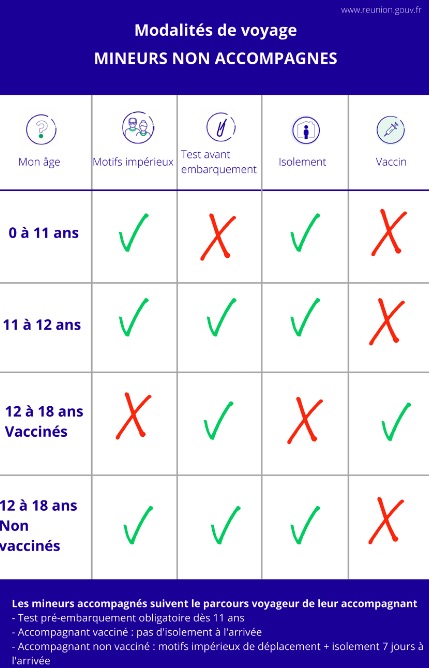 Pour les mineurs qui disposent d’un schéma vaccinal complet (ce qui est désormais possible à partir de 12 ans), ils n’ont pas à présenter un motif impérieux justifiant leur déplacement en provenance ou à destination de La Réunion et sont dispensés des mesures d’auto-isolement dans les deux sens. Ils suivent donc les mêmes règles que pour un adulte vacciné.