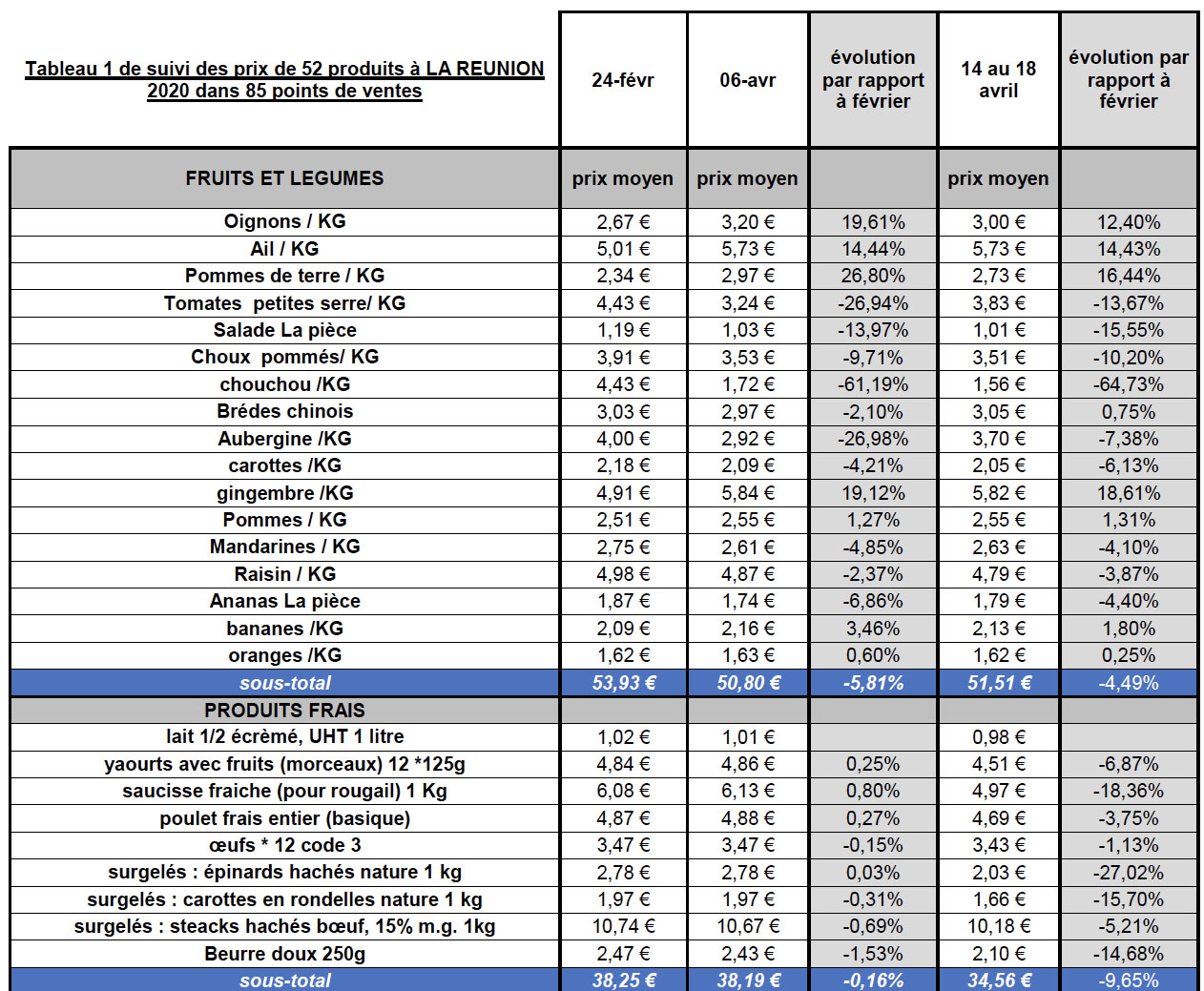 Concernant le panier complémentaire de 52 produits de première nécessité, une légère baisse des prix a pu être constatée depuis fin février 2020 à La Réunion (voir le tableau 1 pour le détail des prix de ces 52 produits).