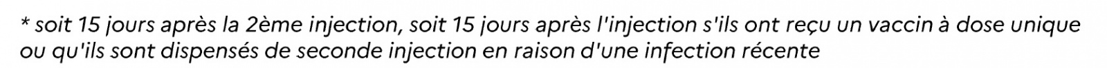 - 2 semaines après la 2ème injection pour les vaccins à double injection (Pfizer, Moderna, Astra Zeneca).