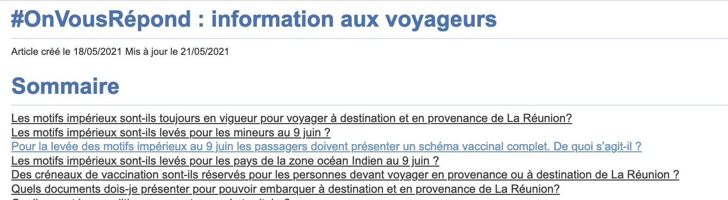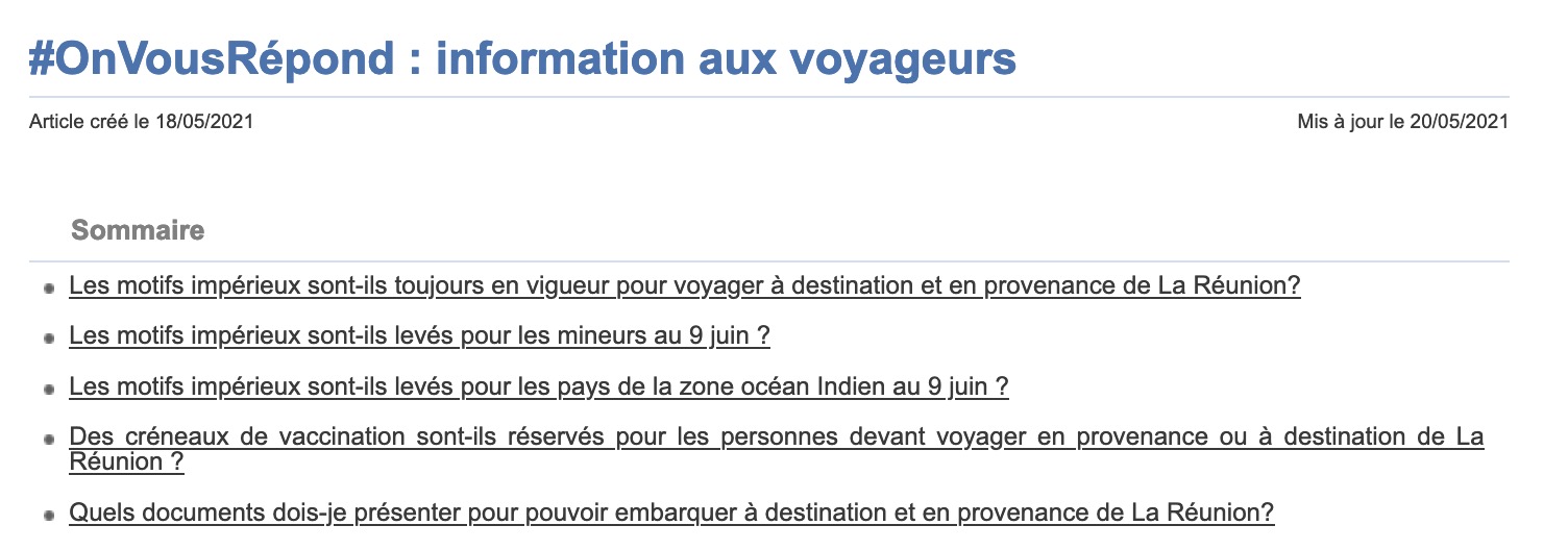 D'abord, sur la foire aux questions de la préfecture de La Réunion, dans une version du site datant du 20 mai, nulle trace de cette précision de 15 jours d'attente. A ce jour il suffit de retourner sur le site pour constater que les délais ont été ajoutés, sans communication supplémentaire de la part de la préfecture. La mise à jour a donc été faite entre le 20 et le 23 mai (dès le vendredi 21 mai au soir en accord avec l'indication de mise à jour du site et les retours des internautes).