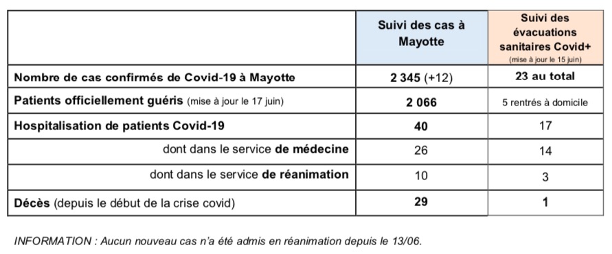 Ce mercredi 17 juin 2020, 12 nouveaux de Covid-19 ont été confirmés à Mayotte. 40 personnes sont actuellement hospitalisées, dont 10 en service de réanimation. Nous publions ci-dessous le communiqué de l'ARS de Mayotte.