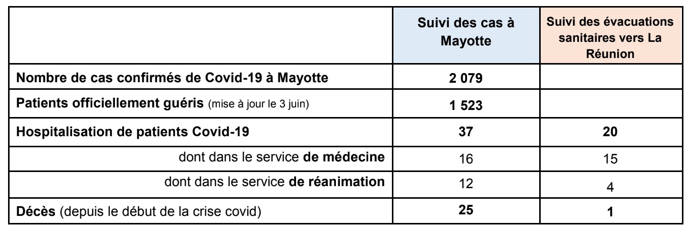 L'ARS de Mayotte annonce 21 nouveaux cas de Covid-19, ce qui fait monter le bilan total sur l'île à 2.079 cas confirmés depuis le début de l'épidémie. L'ARS informe également que 1.523 personnes sont guéries. Par ailleurs, 37 patients sont hospitalisés dont 12 en service de réanimation. Mayotte compte aussi 25 décès depuis que le virus a fait son entrée sur l'île. A noter enfin le nombre d'évacuations sanitaires vers La Réunion : 20 en tout, et le décès d'un patient mahorais qui a succombé au virus alors qu'il venait d'arriver au CHU de nord. (Photo d'illustration rb/www.ipreunion.com)