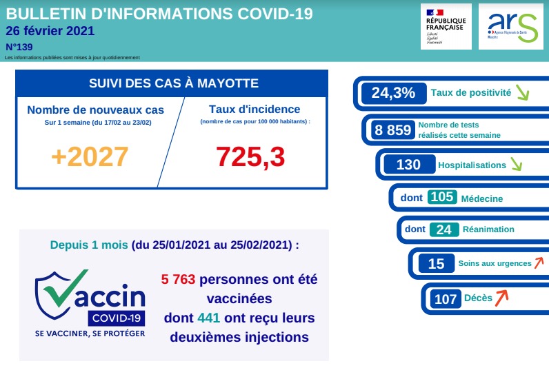 L'agence régionale de santé de Mayotte fait part de cinq nouveaux décès à déplorer, portant à 107 le total de décès liés au coronavirus depuis le début de l'épidémie (dont 7 à La Réunion après évacuations sanitaires). Il s'agit de deux personnes hospitalisées en réanimation à la Réunion suite à leur EVASAN (58 et 75 ans), de deux personnes hospitalisées en médecine (81 et 85 ans) et d'une personne décédée à domicile (80 ans). Depuis un mois, 5.763 personnes ont été vaccinées à Mayotte, dont 441 ont reçu leur deuxième injection, indique l'ARS. Le taux d'incidence sur place est de 725 pour 100.000 habitants. (Photo photo RB imazpress)