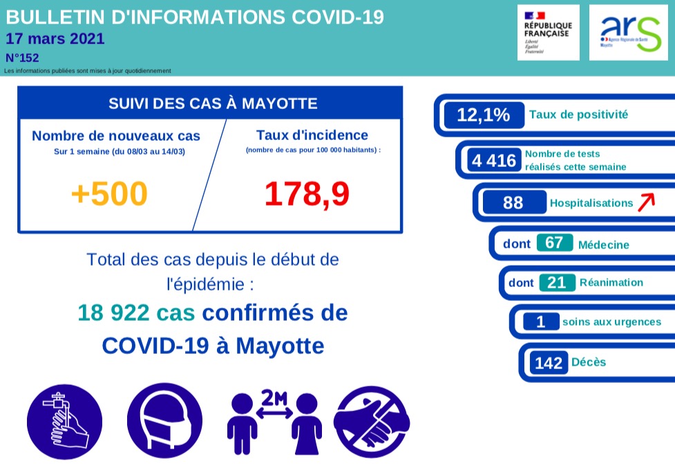 Mayotte a enregistré 500 nouveaux cas de Covid-19 en une semaine, entre le 8 et le 14 mars 2021. Cinq nouveaux décès sont à déplorer, portant à 142 le total de décès liés au coronavirus depuis le début de l'épidémie. Il s'agit des patients évacués sanitairement à La Réunion. Le taux d'incidence sur la semaine est de 178,9 cas pour 100 000 habitants. 88 patients sont actuellement hospitalisés au CHM dont 67 en médecine et 21 en réanimation (Photo d'illustration rb/www.ipreunion.com)