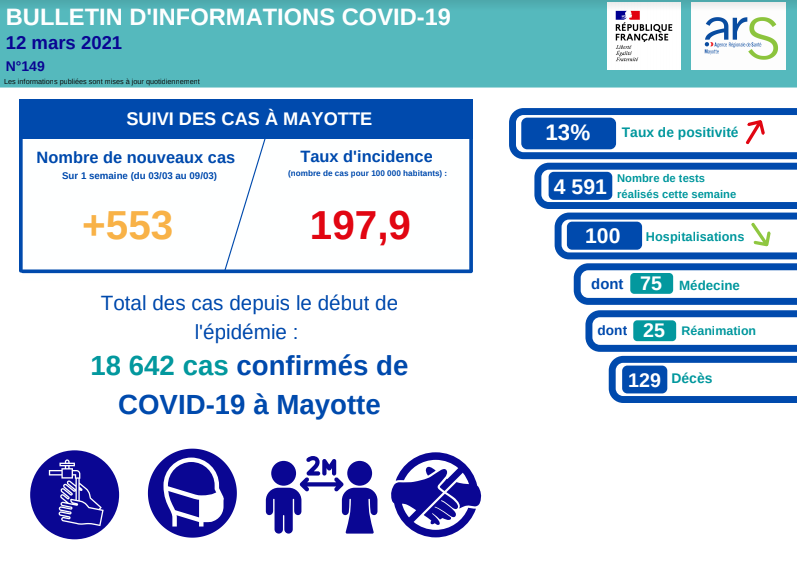 Alors que Mayotte se déconfinera ce lundi 15 mars 2021, le nombre de cas de Covid est remonté très légèrement ces derniers jours. Du 3 au 9 mars, 553 cas ont été enregistrés selon le dernier rapport de l'agence régionale de santé (ARS) contre 544 cas lors du dernier bilan. Le taux de positivité est de 13 % alors que le taux d'incidence et de 197.9 pour 100.000 personnes. Les hospitalisations sont en revanche en baisse avec 100 personnes prises en charge contre 109 lors du dernier bilan. 25 personnes ont été admis en réanimation. Pas de nouveau décès à déplorer dans ce bilan de l'ARS. (Photo photo RB imazpress)