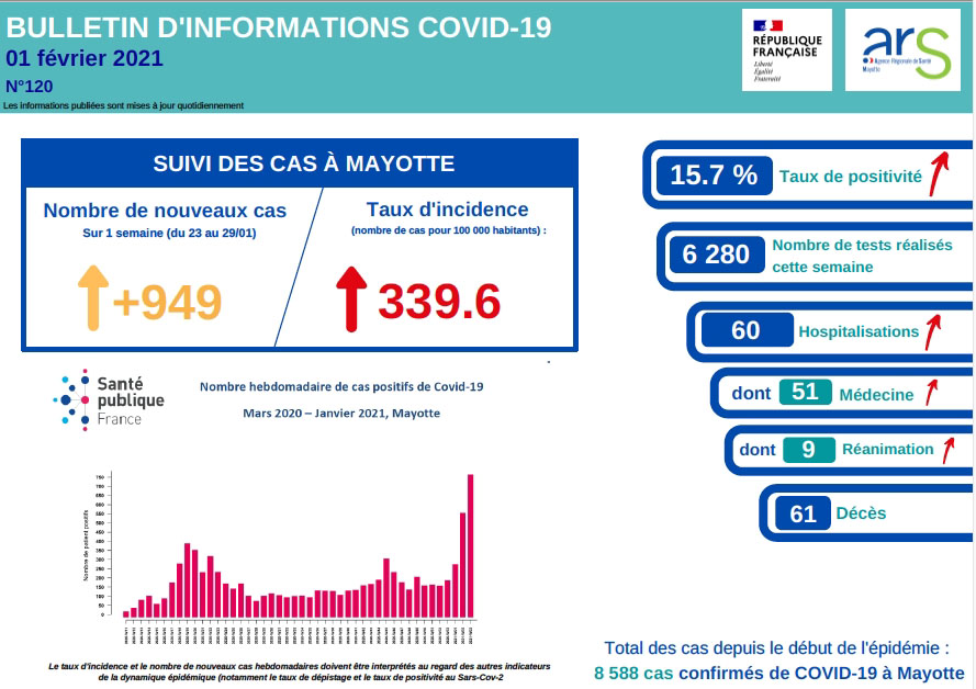 La situation sanitaire ne s'améliore pas à Mayotte. En une semaine 949 nouveaux de covid ont été recensés par les autorités sanitaires. Le taux d'incidence reste très élevée avec un 339,6 personnes contaminées pour 100.000 habitants, note l'Agence régionale de santé ce lundi 1er février 2021 (Photo photo RB imazpress)
