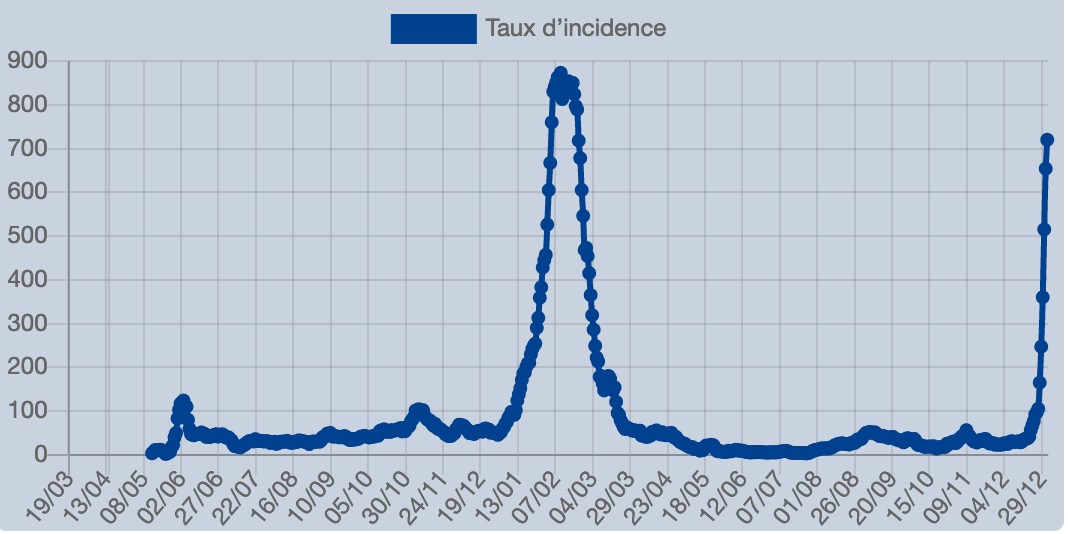 Tous les yeux sont dorénavant rivés sur Mayotte où les indicateurs se dégradent rapidement depuis quelques jours. Mi-décembre, le taux d’incidence n’était que de 30 cas pour 100 000 habitants. Il avait grimpé à plus de 700 en début de cette semaine, pour atteindre désrmais 1 200 cas pour 100 000 habitants, a indiqué le préfet de l'île aux Parfums ce jeudi sur les ondes de Mayotte la 1ere.