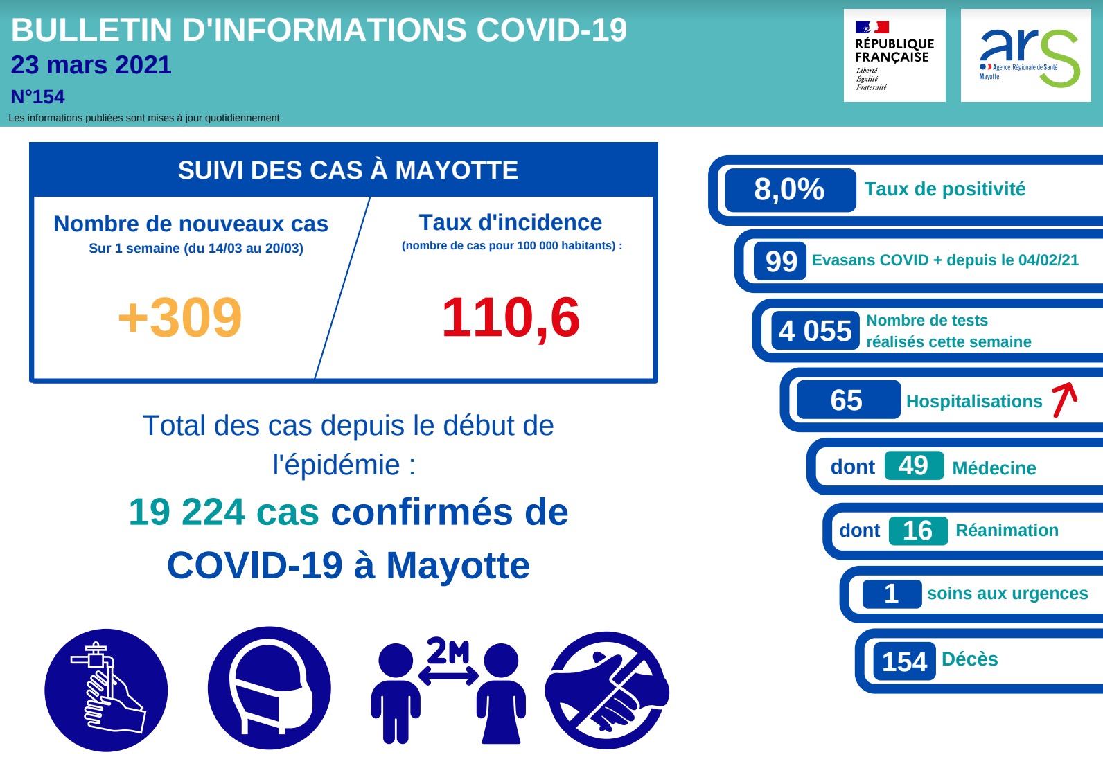 L'agence régionale de santé (ARS) de Mayotte publie son bilan quotidien sur la situation épidémique. Sur une semaine glissante, ce sont 309 nouveaux cas de Covid-19 qui sont enregistrés, pour un taux d'incidence de 110,6 pour 100.000 habitants. Par ailleurs, 65 patients sont actuellement hospitalisés au CHM (centre hospitalier de Mayotte), dont 49 en médecine et 16 en réanimation. Côté vaccination, plusieurs centres sont accessibles toute la semaine de 9h à 14h. "La vaccination permet d'éviter les formes graves de la maladie, les hospitalisations, les admissions en réanimation et les décès" indique l'ARS de Mayotte. (Photo d'illustration : ARS de Mayotte)