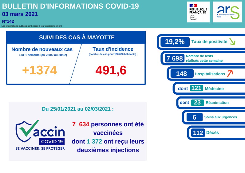Aucun nouveau décès n'a été enregistré ce mercredi 3 mars 2021 à Mayotte. Une journée sans décès et des chiffres qui semblent confirmer un ralentissement de la propagation du virus dans l'île. Du 22 au 28 février, 1.374 cas de Covid ont été recensés pour un taux d'incidence de 491.6 pour 100.000 personnes. Les hospitalisations se maintiennent encore à un niveau très élevé avec 148 personnes prises en main dont 23 en réanimation. La vaccination se poursuit également à Mayotte avec 7.634 personnes vaccinées dont 1.372 personnes qui ont reçu leurs deuxièmes injections. (Photo : agence régionale de la santé)