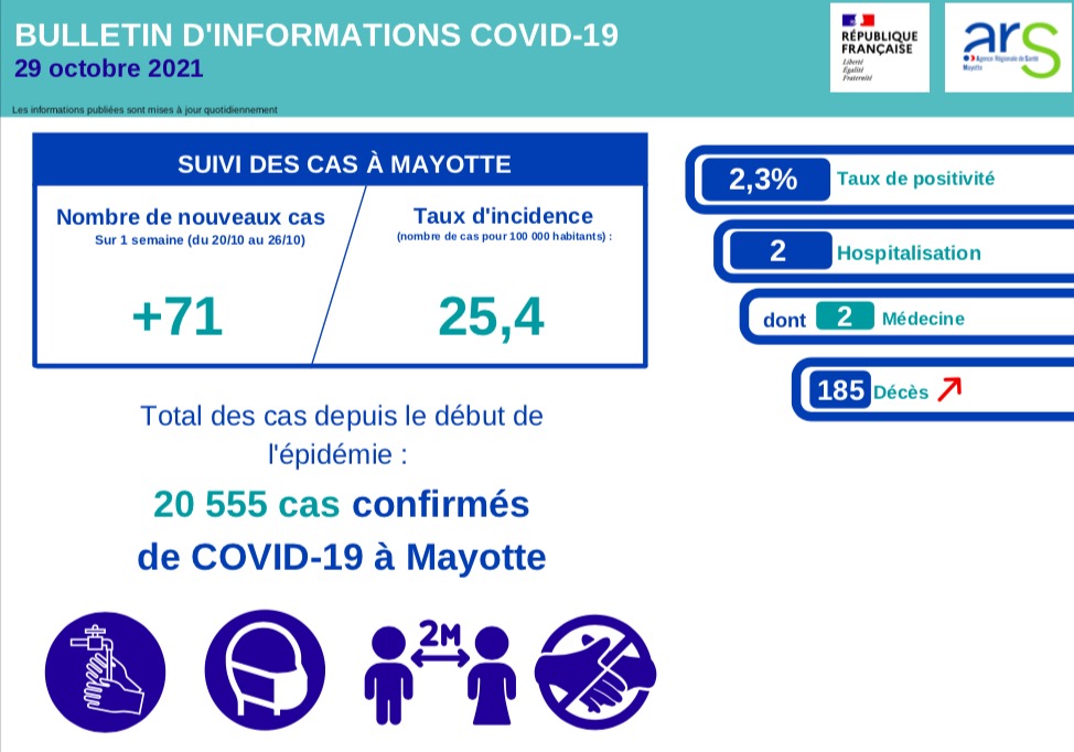 Au cours de la semaine du 20 au 26 octobre 2021, trois décès et 71 cas de Covid-19 confirmés ont été identifiés parmi les patients domiciliés à Mayotte, soit un taux d'incidence de 25,4 cas pour 100 000. Le taux de positivité est de 2,3%. Deux personnes sont actuellement hospitalisées. "Un relâchement général est constaté dans l'application et le respect des mesures barrière. À la veille d'un week-end prolongé, L'ARS rappelle l'importance de ces mesures contre le Covid-19 et la grippe" écrit l'ARS de Mayotte.