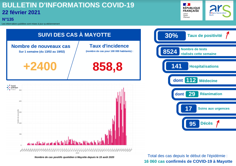 Alors que Mayotte poursuit sa campagne de vaccinations avec le début des injections des deuxièmes doses, le virus continue de tuer dans l'île. Trois nouveaux décès ont été enregistrés par l'agence régionale de santé ce lundi 22 février 2021. Il s'agit d'une personne âgée de 81 ans hospitalisée en médecine, et de deux personnes hospitalisées en réanimation (49 et 57 ans). Au total, 95 personnes sont décédées du Covid-19 depuis le début de l'épidémie dont 5 à La Réunion après évacuations sanitaires. 141 hospitalisations ont été enregistrées à ce jour dont 29 en réanimation. Au cours de la semaine du 13 au 19 février, 2400 cas ont été confirmés à Mayotte pour un taux d'incidence de 858.8 pour 100 000 habitants. Le taux de positivité baisse d'un point et passe de 31 à 30 %. Sur la semaine, 8.524 tests ont été réalisés. (Photo rb/www.ipreunion.com)