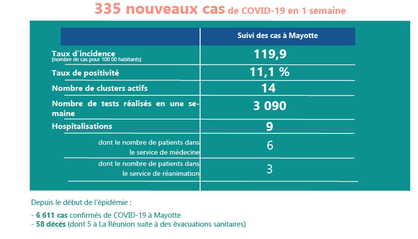 "Une personne âgée de 80 ans est décédée de la Covid-19" indique l'agence régionale de santé de Mayotte. Depuis le début de l'épidémie 58 malades sont morts des suites du coronavirus. Avec 335 nouveaux cas au cours des sept derniers jours, la tendance des contaminations est à l'augmentation se poursuit cette semaine ajoute l''ARS de Mayotte