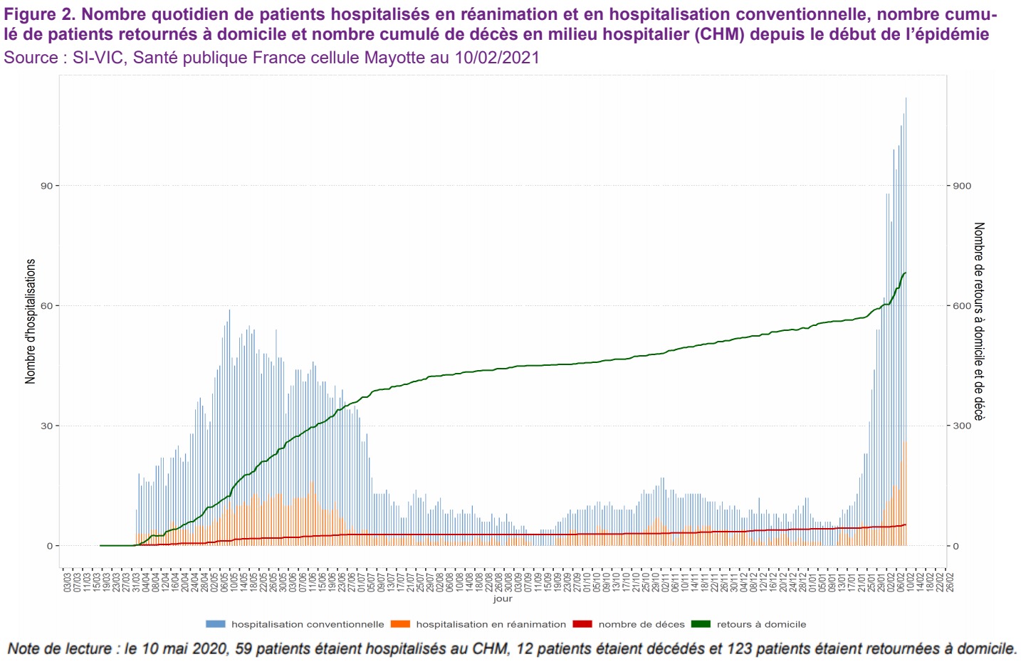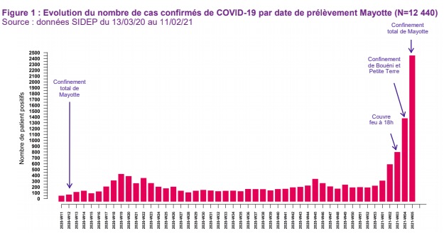 Au 11 février 2021, Mayotte comptabilise 12.440 cas cumulés depuis le début de la pandémie, sur plus de 81.000 personnes testées. Le nombre de cas explose de semaine en semaine : alors qu'il était de 749 il y a deux semaines, il est passé à 1.326 personnes positives la semaine dernière et ce sont désormais 2.402 nouveaux cas qui sont enregistrés en une semaine.