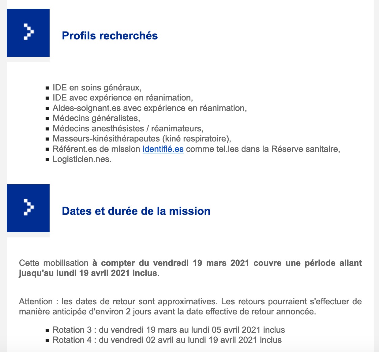 Les profils recherchés sont nombreux : "infirmier.e.s en soins généraux et en réanimation, aides-soignant.e.s, médecins généralistes, anesthésistes, kinés, référent.e.s de missions et logisticien.ne.s".