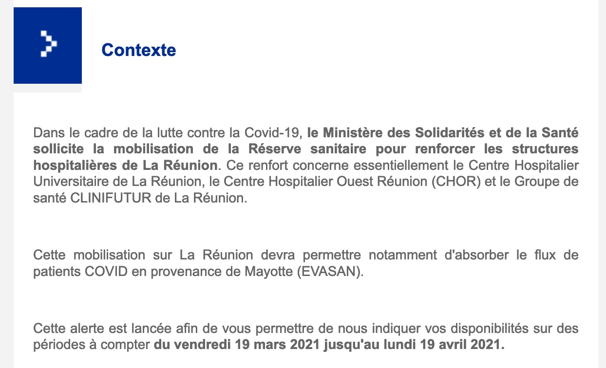 Pour venir prêter main forte aux hôpitaux de La Réunion, les volontaires inscrits à la réserve sanitaire sont appelés à se faire connaître pour deux périodes allant d'abord du 19 mars au 5 avril, l'autre allant du 2 avril au 19 avril 2021.