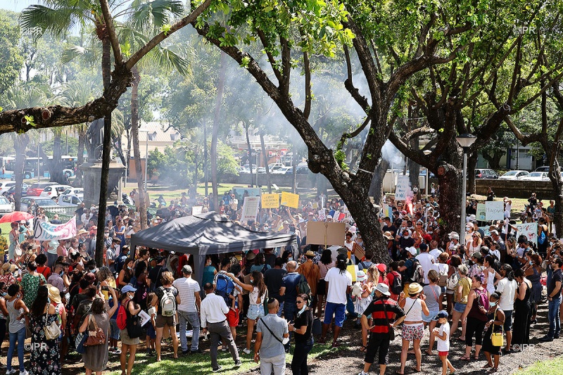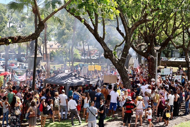 Beaucoup de personnes sont rassemblées devant la préfecture, à l'appel du collectif Parents 974