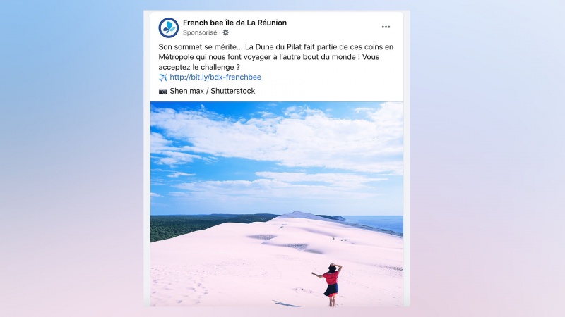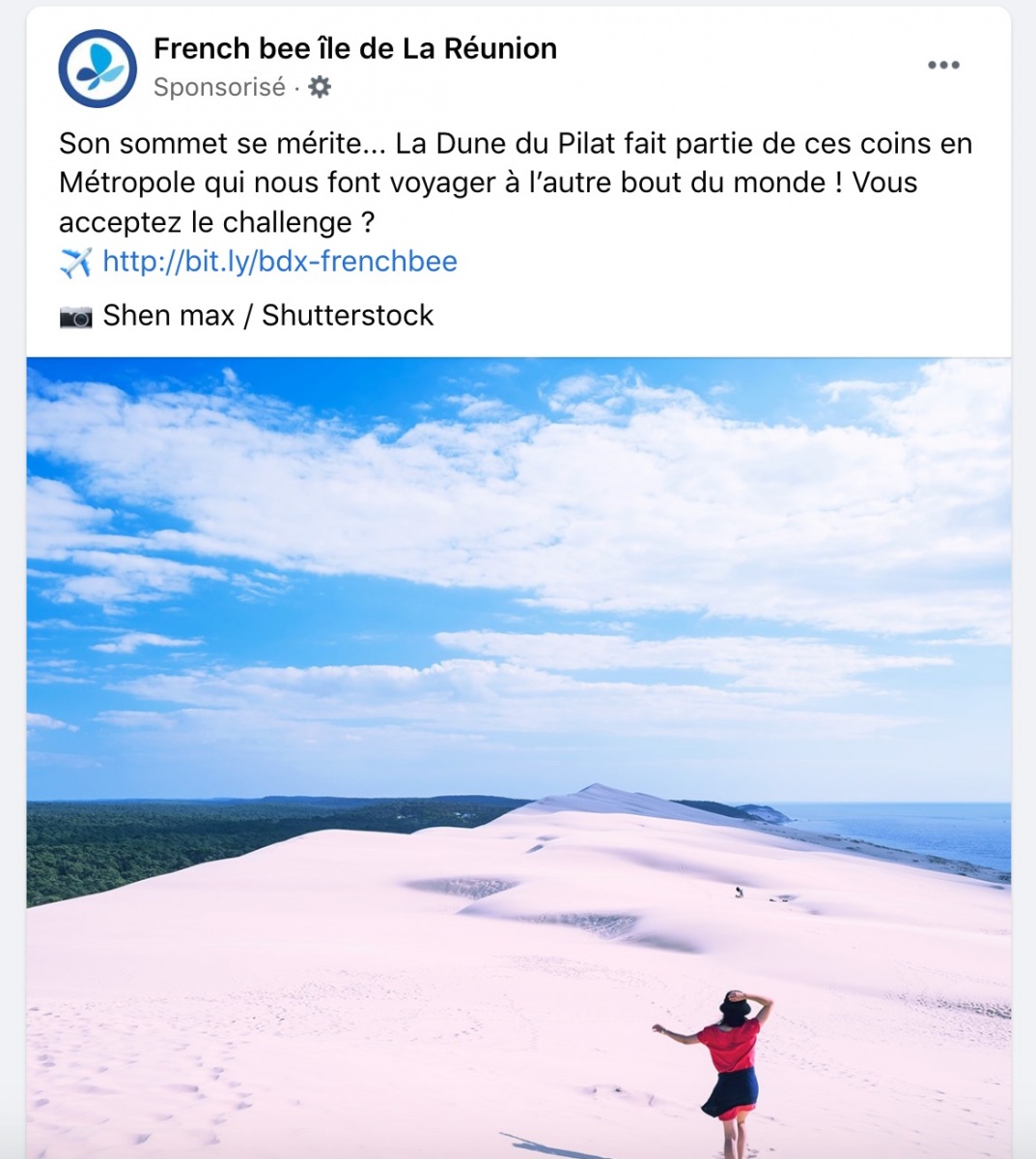 Si des vacances en Métropole vous font rêver, French Bee enfonce le clou. Malgré la mesure des motifs impérieux toujours en place dans un sens comme dans l'autre, la compagnie aérienne fait de la pub pour aller visiter les plus beaux endroits de l'Hexagone, comme la dune du Pilat au bassin d'Arcachon ou le Mont Saint-Michel. Des découvertes magnifiques certes... mais hors de portée en ce moment.