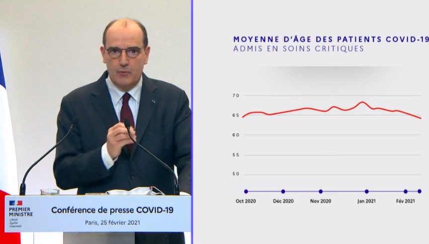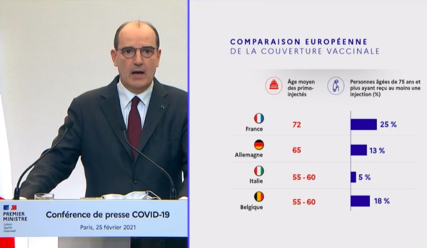 Le gouvernement semble avoir de grandes difficultés à publier des cartes et des graphiques corrects. Quand ce n'est pas les Outre-mer qui sont représentés à l'envers, ce sont les drapeaux. En effet, lors de la conférence de presse de Jean Castex, Premier ministre, ce jeudi soir 25 février 2021, les drapeaux de la France et de l'Italie sont apparus à l'envers. Dans un graphique, le mois de décembre est aussi apparu entre le mois d'octobre et de novembre 2020 (Capture d'écran Jean Castex)