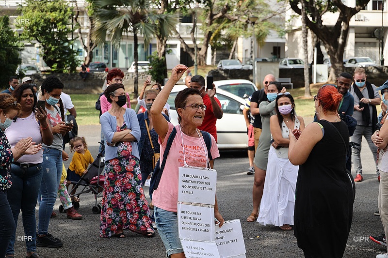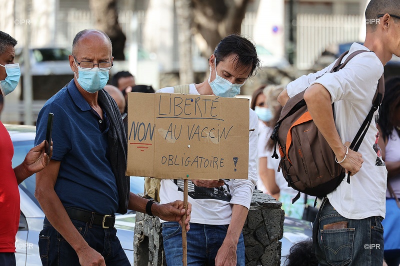 A l'appel de plusieurs collectifs déjà mobilisés ce mercredi 14 juillet 2021 à Saint-Denis, environ 200 personnes manifestent à Saint-Pierre ce vendredi matin. Elles se sont rassemblées sur le rond-point du Macdo dans un premier temps, puis se sont rendues vers la mairie et la sous-préfecture. Une centaine de manifestant.es sont réunie.s devant la préfecture à Saint-Denis ce vendredi après-midi. Les participant.e.s protestent contre les annonces d'Emmanuel Macron notamment la mise en place d'un pass sanitaire dès la fin juillet et l'obligation vaccinale pour les soignant.e.s (Photos Imaz Press)