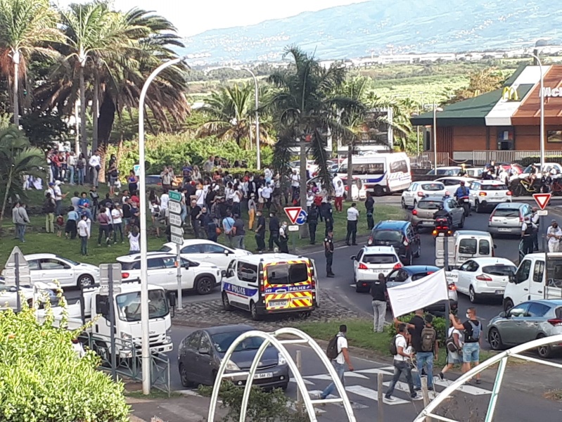 Les manifestants se sont rendus devant la préfecture, sur le Barachois, avant de gagner l'entrée ouest de la ville. Bloqués par les forces de l'ordre pour les empêcher d'accéder à la Route du littoral, ils ont finalement regagné le jardin de la préfecture pour y terminer la matinée.