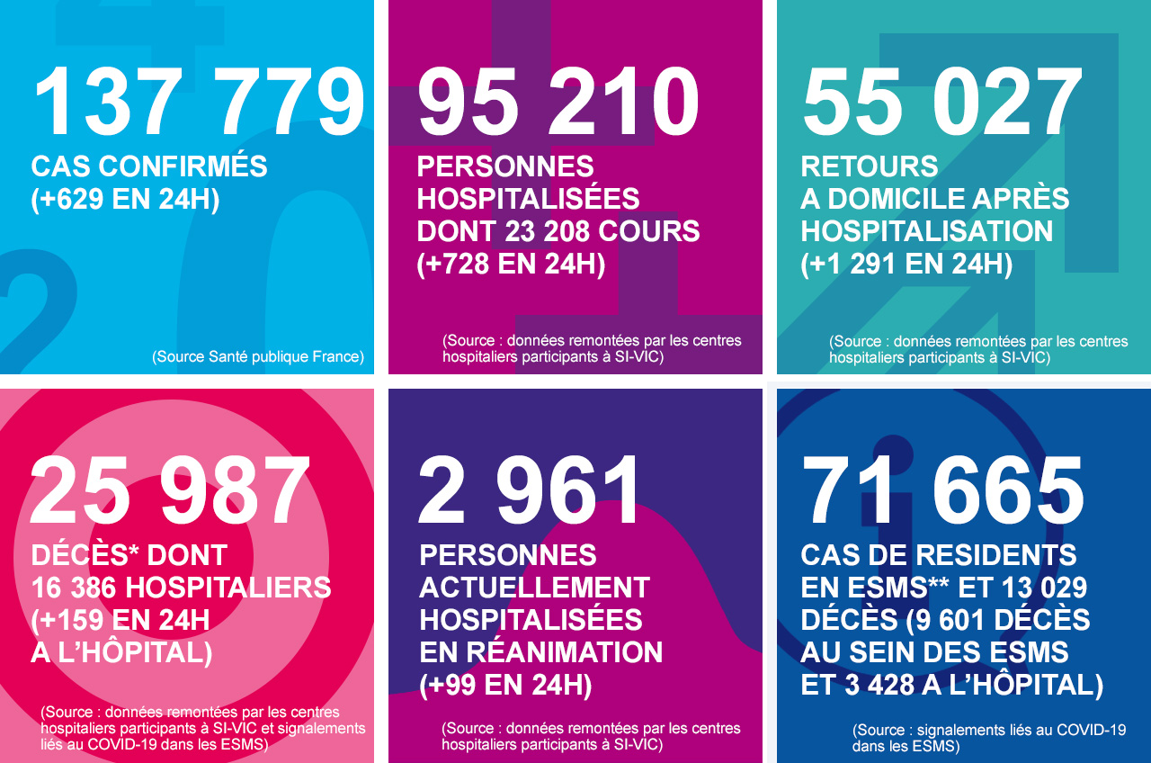 • En France, on dénombre 243 décès supplémentaires en 24 heures, soit 26.230 morts au total depuis le début de la pandémie.
