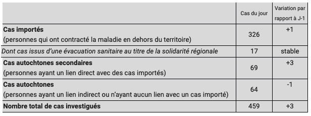 459 cas ont été investigués à cette heure par l’ARS, Santé publique France et l’Assurance Maladie, dont 71% sont des cas importés.
