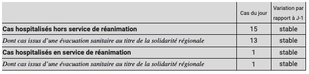 • 1 cas autochtone comptabilisé, dans le point de situation d’hier, a été requalifié en cas autochtone secondaire ce jour.