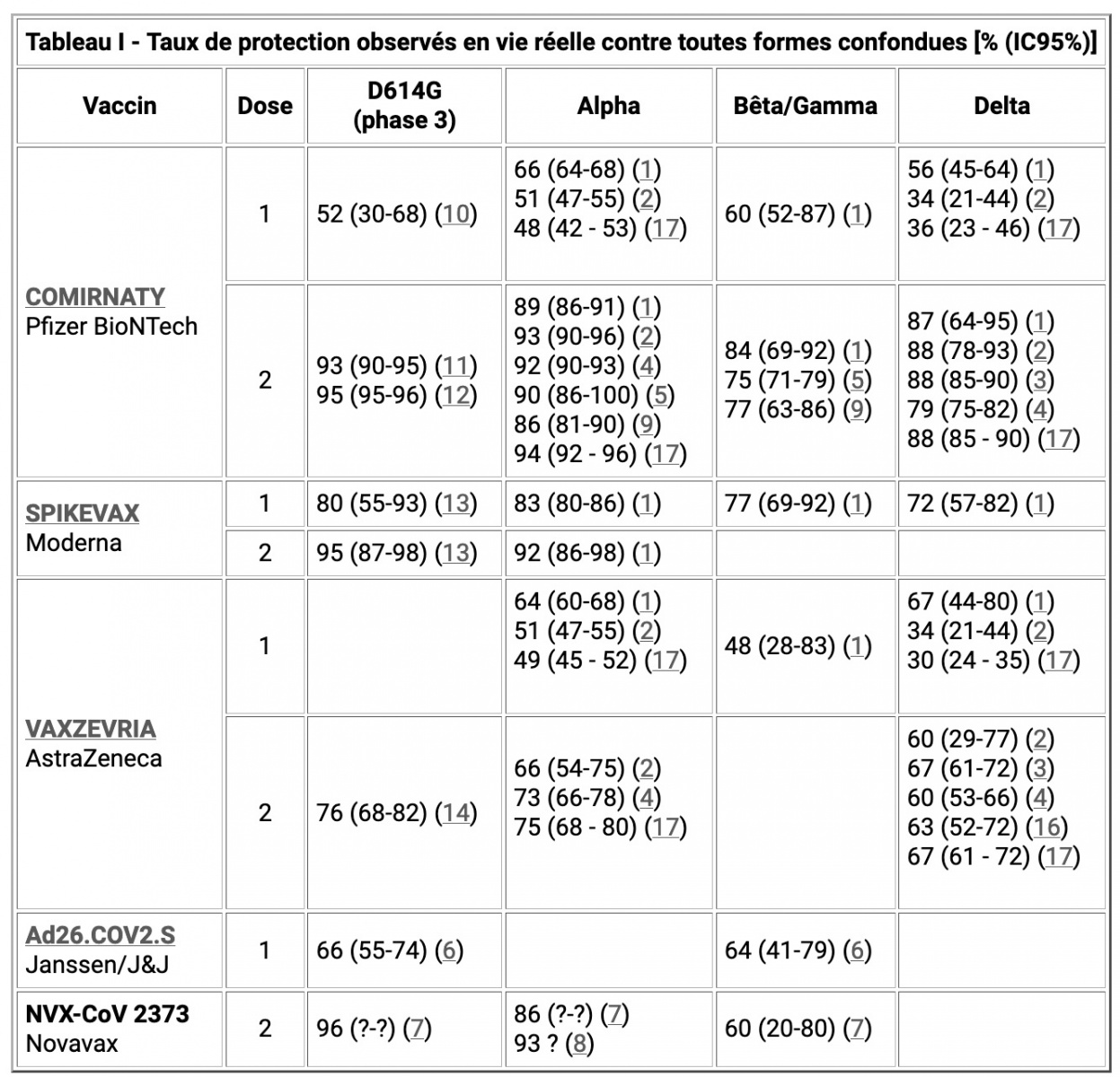 Le site de référence Vidal répertorie sous forme de tableau le niveau de protection moyen en fonction des vaccins mais aussi des variants (alpha/anglais, bêta/sud-africain et delta/indien). Nous le reproduisons ci-dessous :