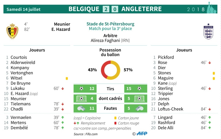 Le N.10 de Chelsea, servi par De Bruyne, déposait Phil Jones pour ensuite tromper Jordan Pickford du droit (82).Hazard clamait après la défaite contre la France que la Belgique "était la plus belle équipe" de la Coupe du monde. Faute de mieux, avec sa troisième place, la "génération dorée" offre à son pays le meilleur classement de son histoire.