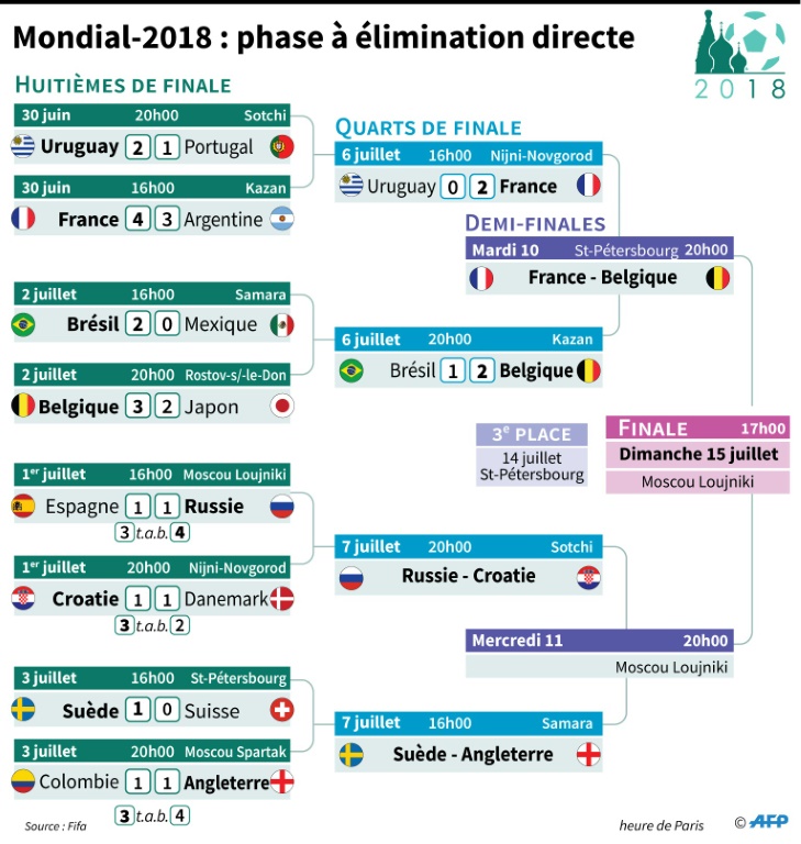 Grâce à un but contre son camp de Fernandinho (13e) et une frappe sublime de Kevin de Bruyne (31e), la génération dorée belge s'offre le droit d'affronter la France en demi-finale, mardi à Saint-Pétersbourg, et peut rêver à un premier sacre mondial.