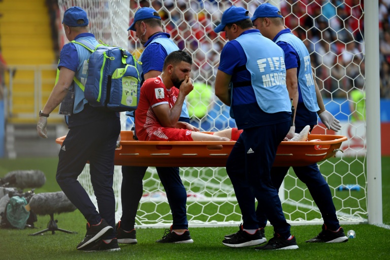 Bronn, 23 ans et joueur à La Gantoise en Belgique, s'est blessé tout seul sur un appui, à proximité de sa surface de réparation. Il avait réduit le score quelque minutes plus tôt sur un coup franc de son capitaine Wahbi Khazri, alors qu'Eden Hazard (6e, s.p.) et Romelu Lukaku (16e) ont marqué les buts belges.