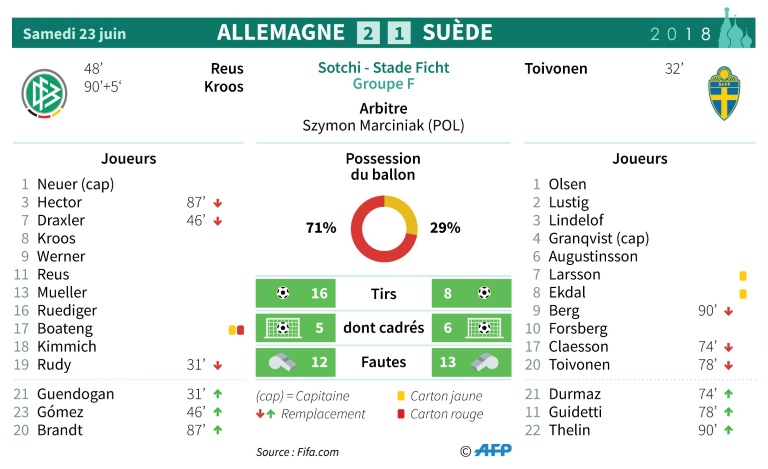 La situation était critique: après leur défaite inaugurale contre le Mexique (0-1), les Allemands étaient dos au mur au stade olympique de Sotchi. Et le sélectionneur Joachim Löw, pour donner des gages à une opinion qui réclamait des têtes, a sacrifié deux de ses fidèles, Mesut Özil et Sami Khedira, laissés sur le banc.
