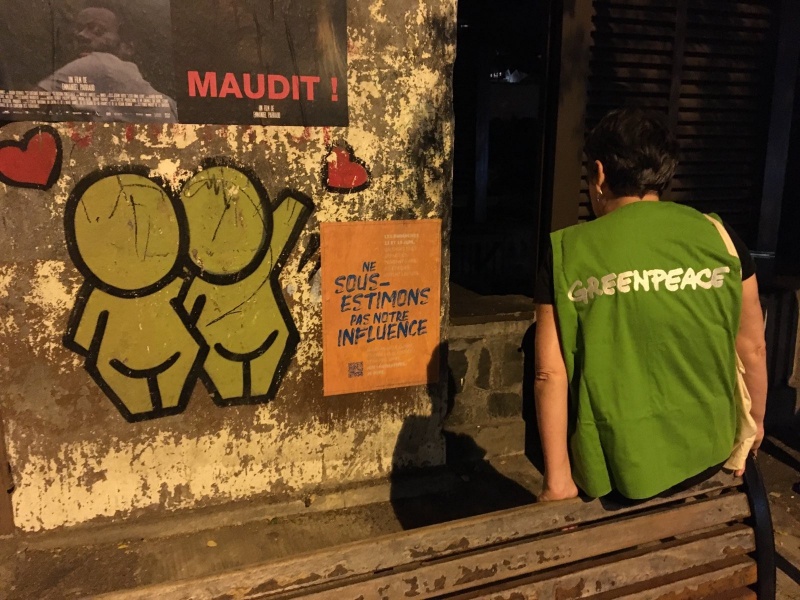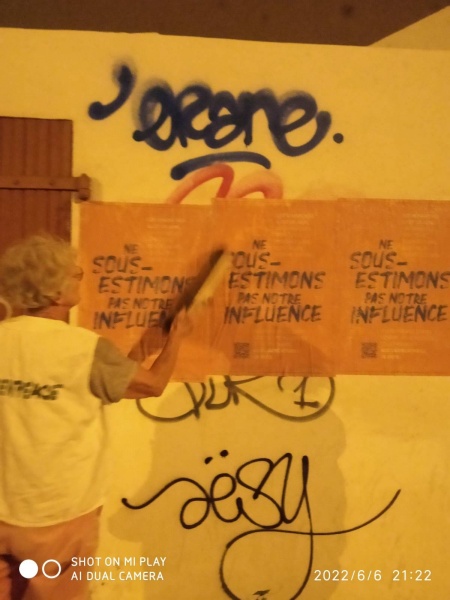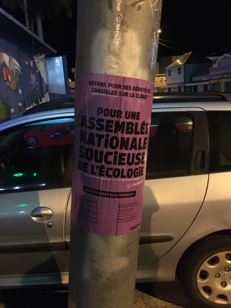 Dans le cadre d'une campagne de mobilisation menée par 16 associations, des militant·es de Greenpeace France, XR et Attac ont collé près de 200 affiches tout autour de l'île depuis jeudi 1er juin et ils iront à la rencontre de jeunes électeurs et électrices, samedi 11 juin, dans les rues commerçantes et les marchés forains de Saint Denis, Saint Pierre et Saint Leu. (Photo : Greenpeace)