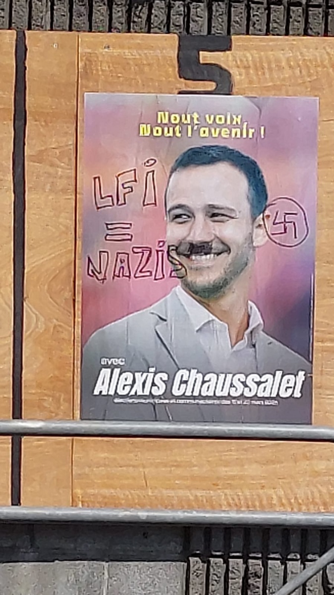 Aujourd’hui, au Tampon les affiches officielles de la liste Nout Voix Nout l’Avenir sont vandalisées avec un propos diffamant laissant penser qu’il existe une égalité entre LFI et le nazisme.