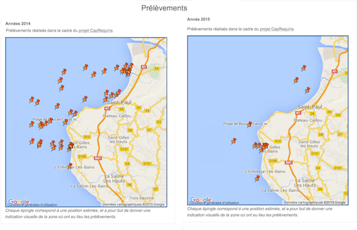 La carte 2015 montre qu'avec Cap Requin 2, cette pêche a été intensifiée et rapprochée du bord.