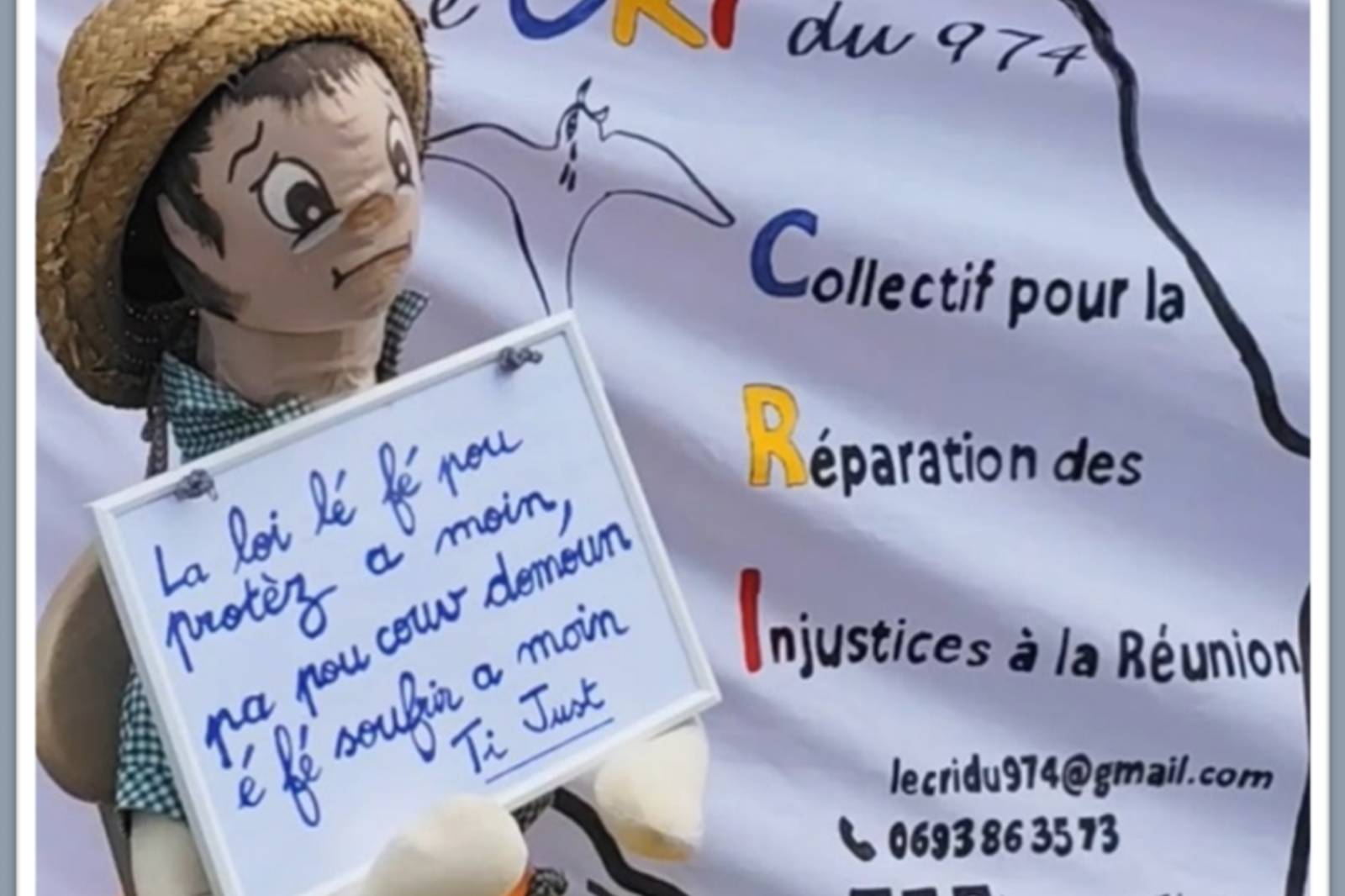 Le CRI du 974 est un collectif citoyen responsable, pacifique et indépendant. Trois membres du CRI ont été auditionnés dans le cadre de la commission d'enquête "dysfonctionnements obstruant l'accès à une justice adaptée aux justiciables ultramarins", le 12 novembre 2025 (audition n°51). En l'état, le collectif ne reconnaît pas les conclusions finales du rapport de la commission concernant la Réunion en ce sens que ce rapport a mis sous silence de nombreux dysfonctionnements très graves notamment concernant les jugements des tutelles ou encore concernant l'absence de recours réels dans certains dossiers, la partialité dans d'autres etc. Pendant plusieurs mois, le CRI du 974 sillonnera l'île en compagnie de sa mascotte Ti Just afin d'informer les réunionnais de leurs droits. (Photo : D.R)