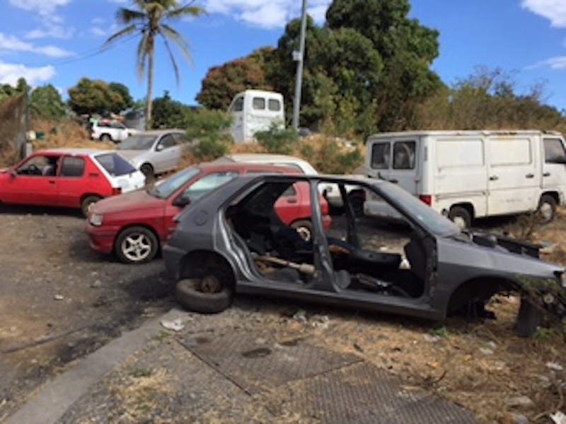 Au vu et au su de tous, un immense cimetière de carcasses de voitures s’étend depuis la résidence Intemporelles A2 jusqu’au Mac Do de la Rivière des galets. Il y en a partout, des désossés, des hors d’usage, sur la route, sur le trottoir, sur le parking, dann z’herbe. Une quinzaine visibles, avec une activité autour. Et cela ne date pas d’hier, ni d’avant-hier.
