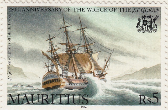 Parti de Lorient, le Saint Géran, lourd vaisseau de la Compagnie des Indes, attendu par le gouverneur Mahé de La Bourdonnais, arrive en vue de l’Isle de France (Maurice). Dans la nuit du 16 au 17 août 1744, drossé sur les brisants de l’ilot d’Ambre il fait naufrage. De nombreux noyés dont plusieurs femmes sont à déplorer… Lors de son séjour dans l’île quelques années plus tard, Bernardin de Saint-Pierre s’empare de ce drame pour écrire « Paul et Virginie », son roman à succès en 1778.