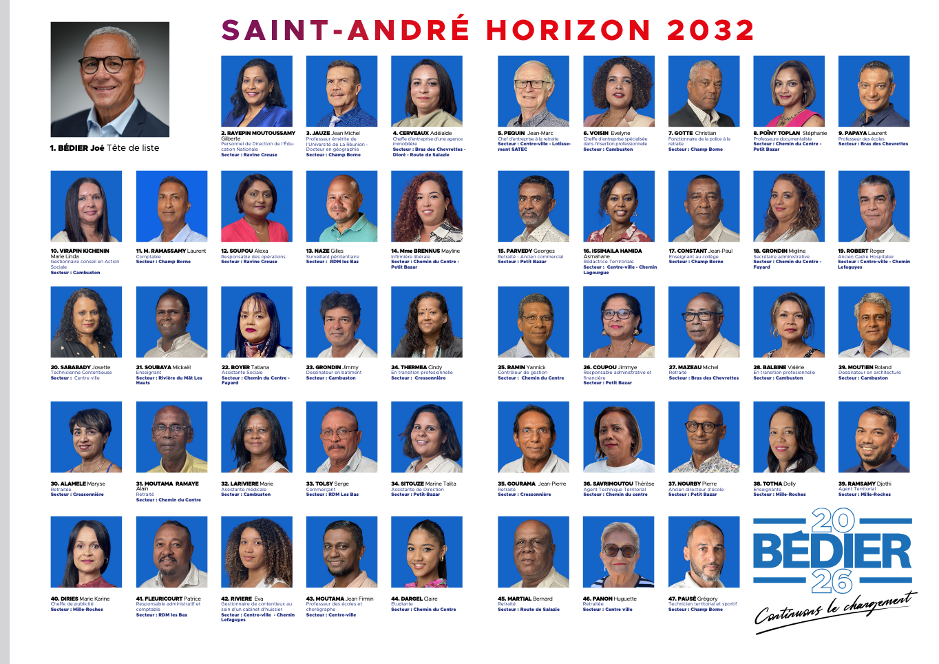 Ce dimanche, Joé Bédier a officiellement présenté à la presse et en direct sur Facebook la liste "Saint- André, Horizon 2032", composée de 47 colistiers engagés pour les élections municipales des 15 et 22 mars 2026.