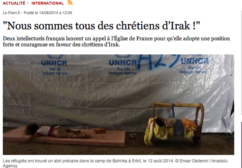 Depuis quelques semaines - et particulièrement ces derniers jours -, une population entière de chrétiens d'Irak fait l'objet d'une extermination ethnique et religieuse déclarée, au nom de l'islam, de la part des troupes barbares de l'EIIL (Da'ich). Femmes, hommes, enfants, civils et religieux sont expropriés, dépossédés de leurs biens, pourchassés de leurs maisons, de leur terre, ou tout simplement lâchement assassinés. A Mossoul, des églises et des bibliothèques sont brûlées (Page d'accueil du site lepoint.fr).