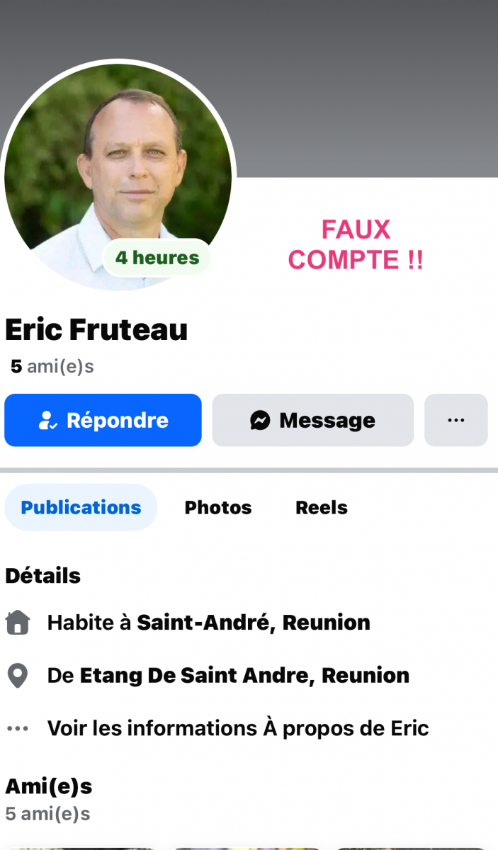 Nous informons la population qu’un faux compte sur la plateforme Facebook a été créé en usurpant l’identité de Éric Fruteau.