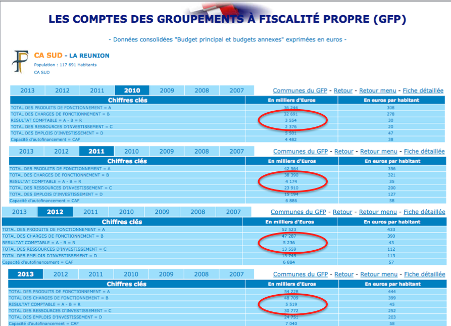 Revenons en à la soi-disant mauvaise gestion de l’ancienne mandature. Et parlons de la gestion soi-disant désastreuse de cette intercommunalité. Comme vous le montre l’image qui n’est d’autre qu’extrait de la base de données gouvernementale accessible de tous (cliquez ici), la situation financière depuis les années 2010 montre un résultat comptable bien positif (comme vous pouvez le constater avec l’extrait joint à ce courrier. À moins de ne pas savoir lire des comptes, TAKALY se trompe. La tromperie se trouve sur le caractère de mauvais gestionnaire. Lorsqu’il y a mauvaise gestion il y a déficit. Mais enfin, nous pourrions avoir une opinion divergente.