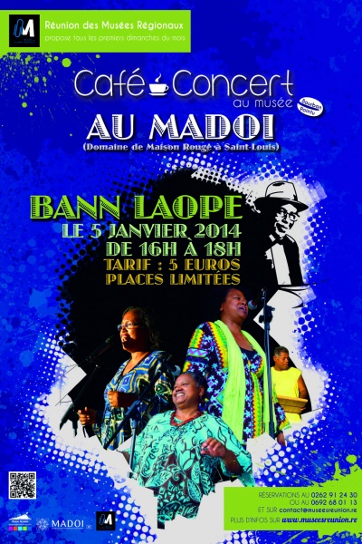 La musées régionaux de la Réunion invite le public au premier café-concert de l'année 2014. Le musée des arts décoratifs de l'océan Indien (MADOI), au domaine de Maison Rouge à Saint-Louis, accueille le groupe Bann Laope le dimanche 5 janvier 2014. Les places, en nombre limité, sont au tarif de 5 euros. Les renseignements et réservations se font par téléphone au 0262 91 24 30 ou 0692 68 01 13 ou par mail sur contact@museesreunion.re. D'autres événements de ce genre seront organisés chaque premier dimanche du mois. (photo D.R.)