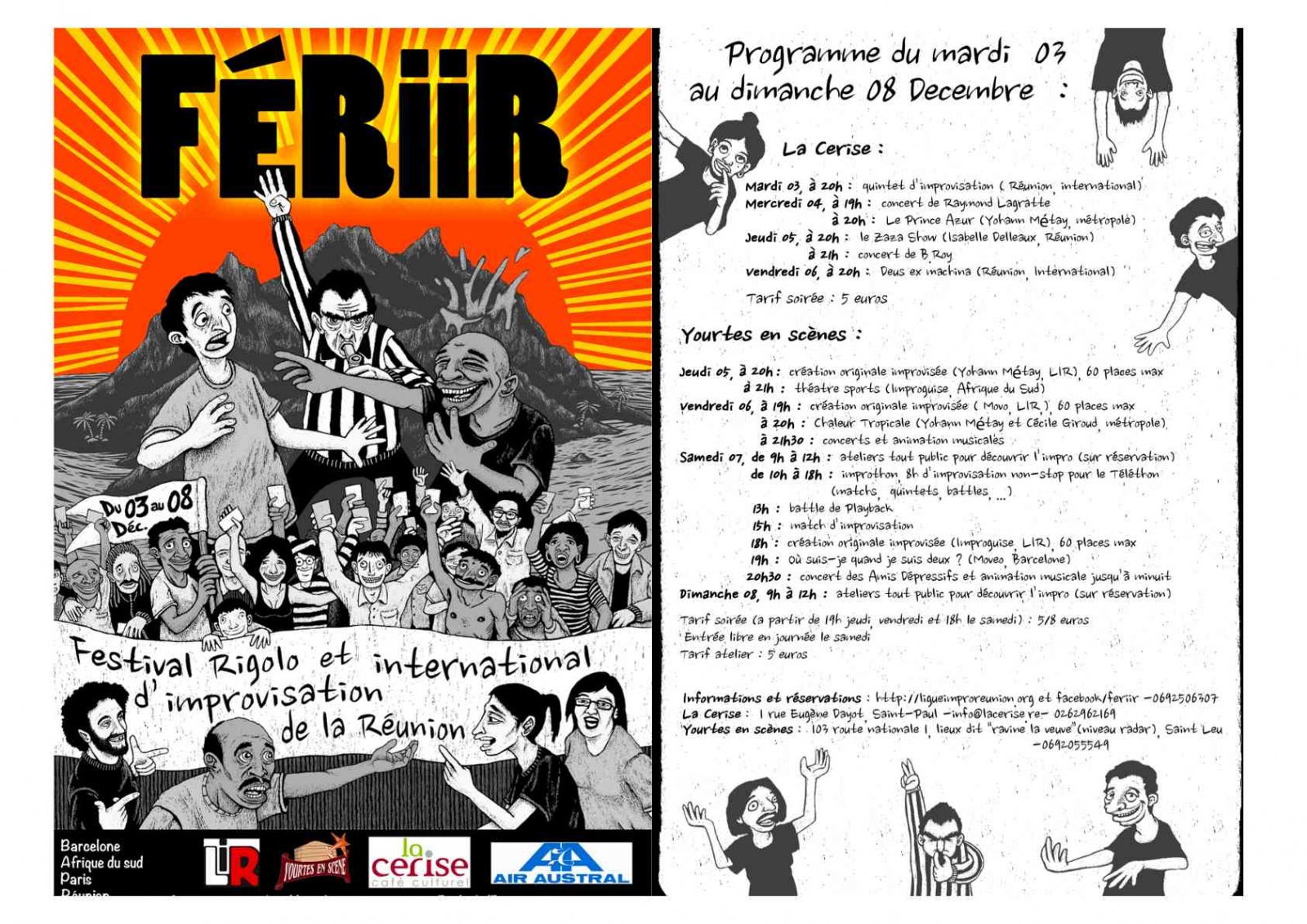 La ligue d'improvisation réunionnaise (Lir) organise du 3 au 8 décembre 2013 le FERiiR 2013 (festival rigolo et international d'improvisation de La Réunion). À l'occasion, des artistes d'Afrique du Sud, d'Espagne, de métropole et de La Réunion vont se rencontrer, chacun apportant une approchant différente de l'improvisation théâtrale, pour le plus grand plaisir du public. Les spectacles se dérouleront à La Cerise (Saint-Paul) et aux Yourtes en Scène (Saint-Leu).