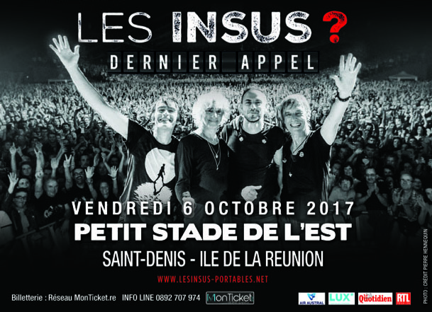 Trois des anciens de Téléphone, le groupe de rock français mythique des années 80 se produiront en concert le vendredi 6 octobre 2017 au Petit Stade de l'Est à Saint-Denis. Jean-Louis Aubert, Louis, Bertignac, Richard Kolinka - les trois ex de Téléphone -), et Aleksander Angelov qui vient de les rejoindre, ont choisi de s'appeler les Insus et de titrer leur tournée "Dernier appel", tout un symbole. Le concert est organisé par Art FM Prod en partenariat avec RTL Réunion. L'occasion d'entendre en live les titres emblématiques tels que LaBombe Humaine, Un Autre Monde, Ça c'est vraiment toi. Souvenir, souvenir