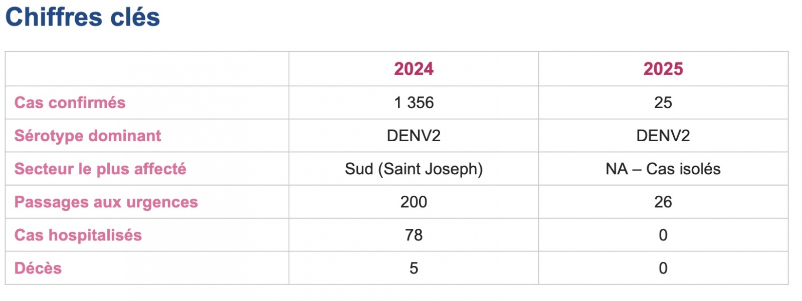 L’analyse globale du bulletin confirme cette amélioration. "L’année 2024 a été marquée par un nombre de cas de dengue modéré, 1.356 cas, en comparaison avec certaines des années précédentes et des épidémies de grande ampleur" , tandis que pour 2025, "on retiendra l’absence de circulation de dengue dans un contexte d’épidémie massive de chikungunya".