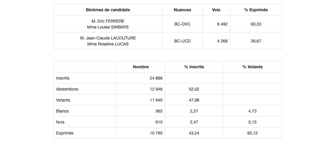 Le binôme Eric Ferrère et Louise Simbaye sortent grands gagnants dès le premier tour des cantonales. 60,33% des votants ont en effet voté en faveur du duo, tandis que leurs opposants Jean-Claude Lacouture et Roseline Lucas ont récolté 39,64% des voix. Un score très serré, qui favorise tout de même le premier binôme (Photo d'illustration rb/www.ipreunion.com)