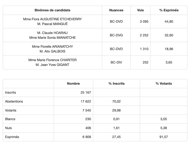 Le binôme Augustine Etcheverry Flora et Mangué Pascal arrive en tête avec 44,80% des suffrages exprimés, suivi de Claude Hoarau et Marie Sonia Imanatche avec 32,60 % des suffrages exprimés. Le binôme Florelle Arianatchy et Alix Galbois arrive en troisième position avec 18,96% des suffrages exprimés. (Photo photo d'archive RB imazpress)