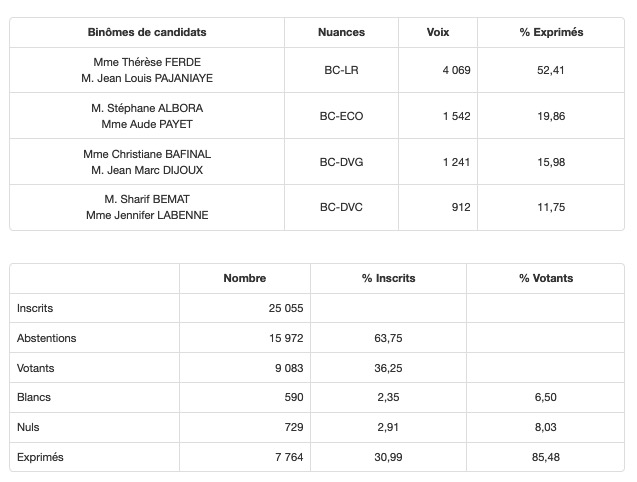 Le binôme de Thérèse Ferde et Jean Louis Pajaniaye est en bonne position pour remporter les sièges de conseillers départementaux pour le canton 20 à Saint-Pierre : ils cumulent 52,41% des voix, loin devant leurs opposants. Stéphane Albora et Aude Payet, en deuxième position, n'ont en effet gagné que 19,86% des voix. Christiane Bafinal et Jean-Marc Dijoux glanent 15,98% des suffrages, et Sharif Bemat et Jennifer Labenne 11,75% (Photo d'illustration rb/www.ipreunion.com)